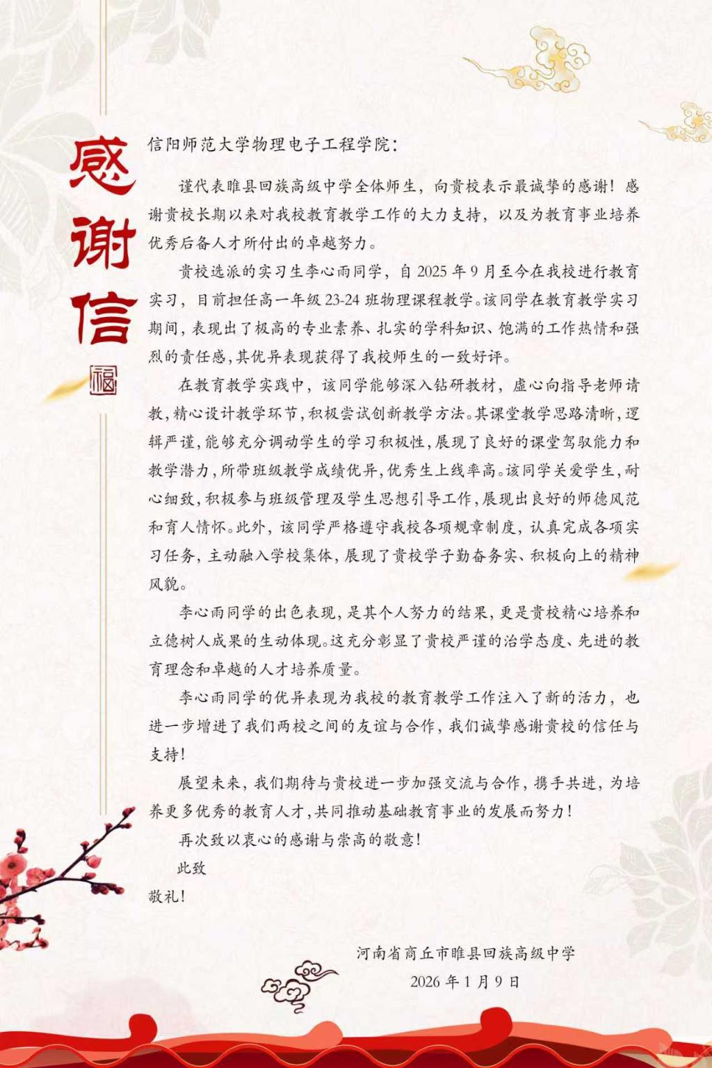 近日,河南省商丘市睢县回族高级中学向我院发来感谢信,对我院2026届实习生李心雨同学的教育实习工作给予高度评价和诚挚感谢。